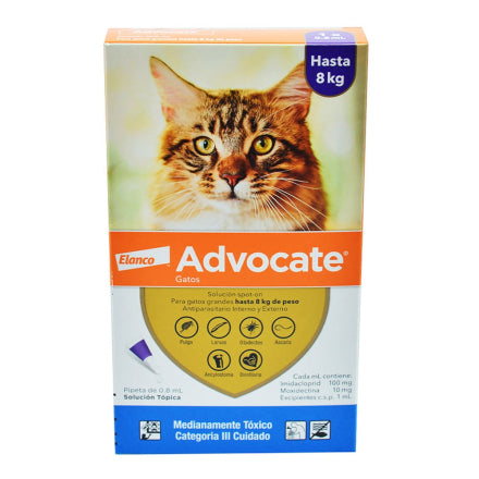 Advocate Gatos es una solución tópica de uso externo diseñada para el tratamiento y control integral de parásitos internos y externos en gatos. Su fórmula avanzada combate eficazmente pulgas (Ctenocephalides felis), ácaros del oído (Otodectes cynotis), y sarna notoédrica (Notoedres cati), además de ofrecer protección contra el parásito del corazón (Dirofilaria immitis, larvas L3 y L4).