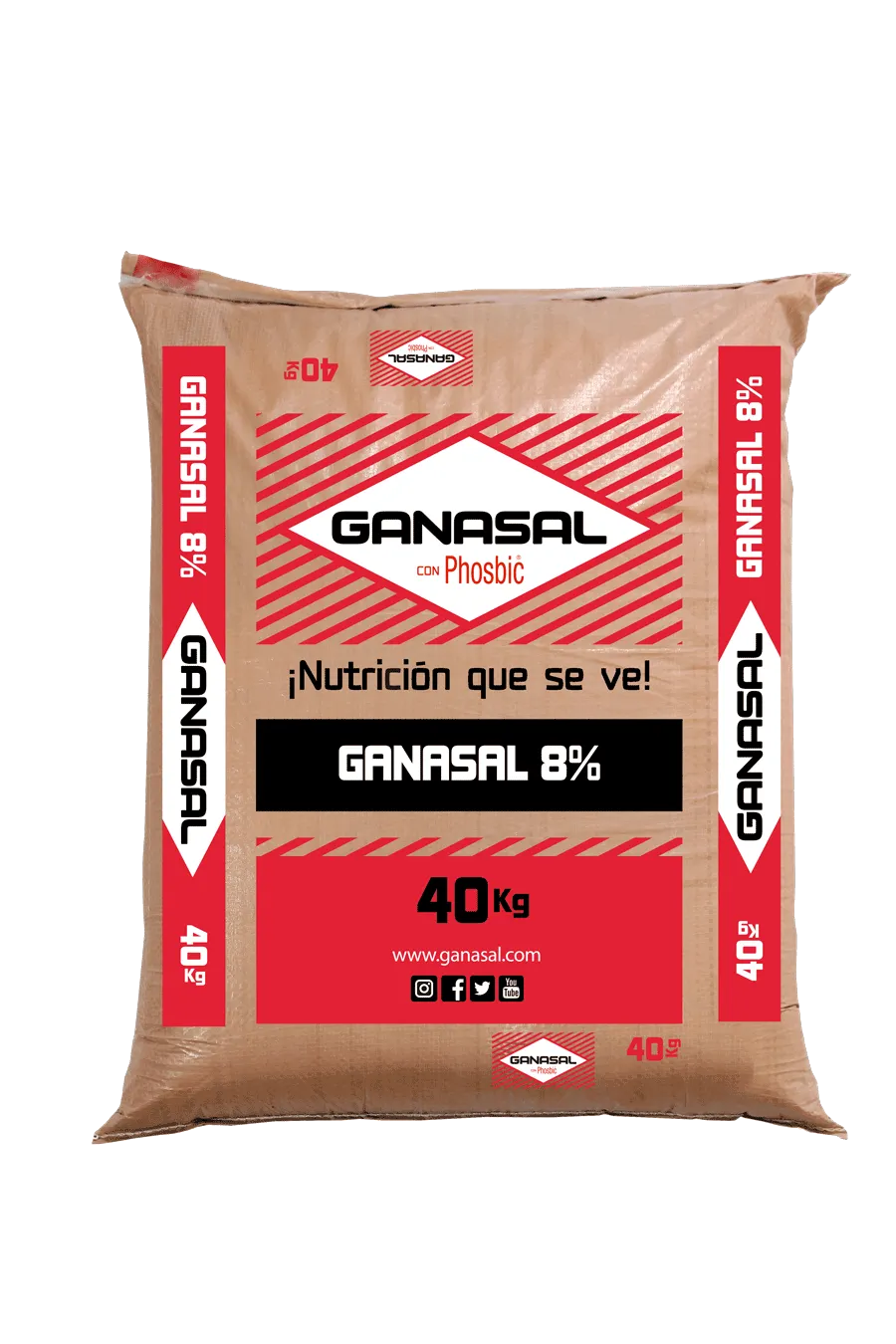 Ganasal 8% es un suplemento mineral diseñado para bovinos de carne y leche, formulado con un balance óptimo de fósforo, calcio, sal y microminerales esenciales. Su uso favorece la ganancia de peso, la producción láctea, la salud ósea y muscular, además de fortalecer el sistema reproductivo, evitando deficiencias que pueden comprometer el desempeño productivo del hato.