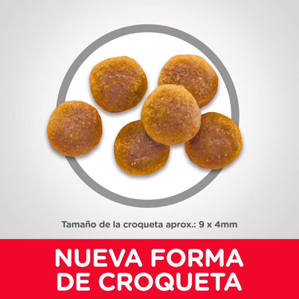 Pollo, trigo entero, harina de gluten de maíz, grasa de pollo, pulpa de remolacha desecada, aceite de soya, cebada perlada quebrada, harina de soya, saborizante de hígado de pollo, sulfato de calcio, ácido láctico, aceite de pescado, cloruro de potasio, fosfato dicálcico, cloruro de colina, sal yodada, vitaminas (complemento de vitamina E, L-ascorbil-2-polifosfato (fuente de vitamina C), complemento de niacina, mononitrato de tiamina, complemento de vitamina A, pantotenato de calcio, complemento de vitamina B12, clorhidrato de piridoxina, complemento de riboflavina, biotina, ácido fólico, complemento de vitamina D3), taurina, minerales (sulfato ferroso, óxido de zinc, sulfato de cobre, óxido manganoso, yodato de calcio, selenito de sodio), tocoferoles mixtos para la frescura, sabores naturales, beta caroteno.