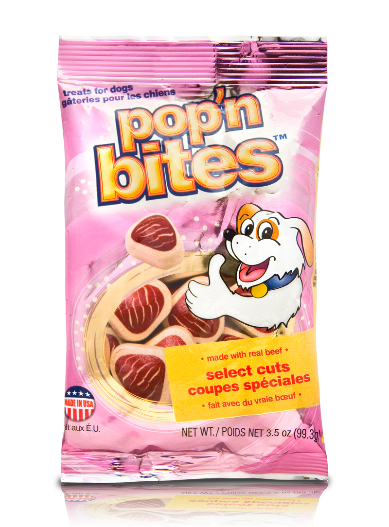 Las golosinas Pop'n Bites tienen un sabroso sabor a carne que seguramente será el nuevo favorito de tu peludo amigo.